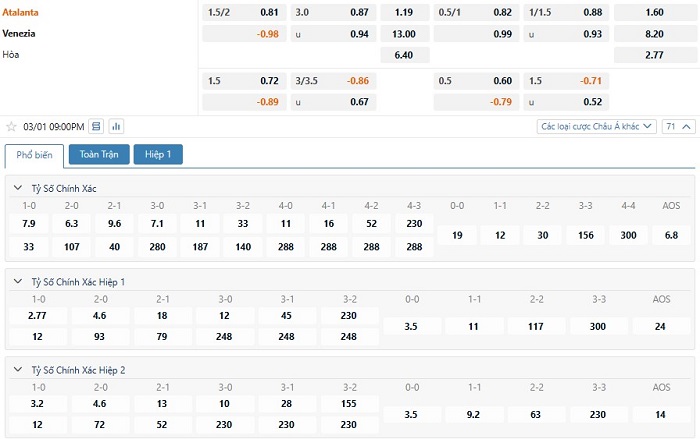 Bảng tỷ lệ kèo bóng đá trận đấu Atalanta vs Venezia